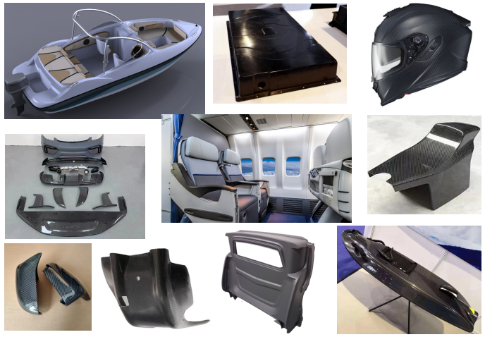 航空宇宙、鉄道輸送、自動車内外装、スポーツ用品、医療美容、白物家電、手工芸品、衛生陶器などの業界における金型製造、複合材料加工、厚板熱成形加工。